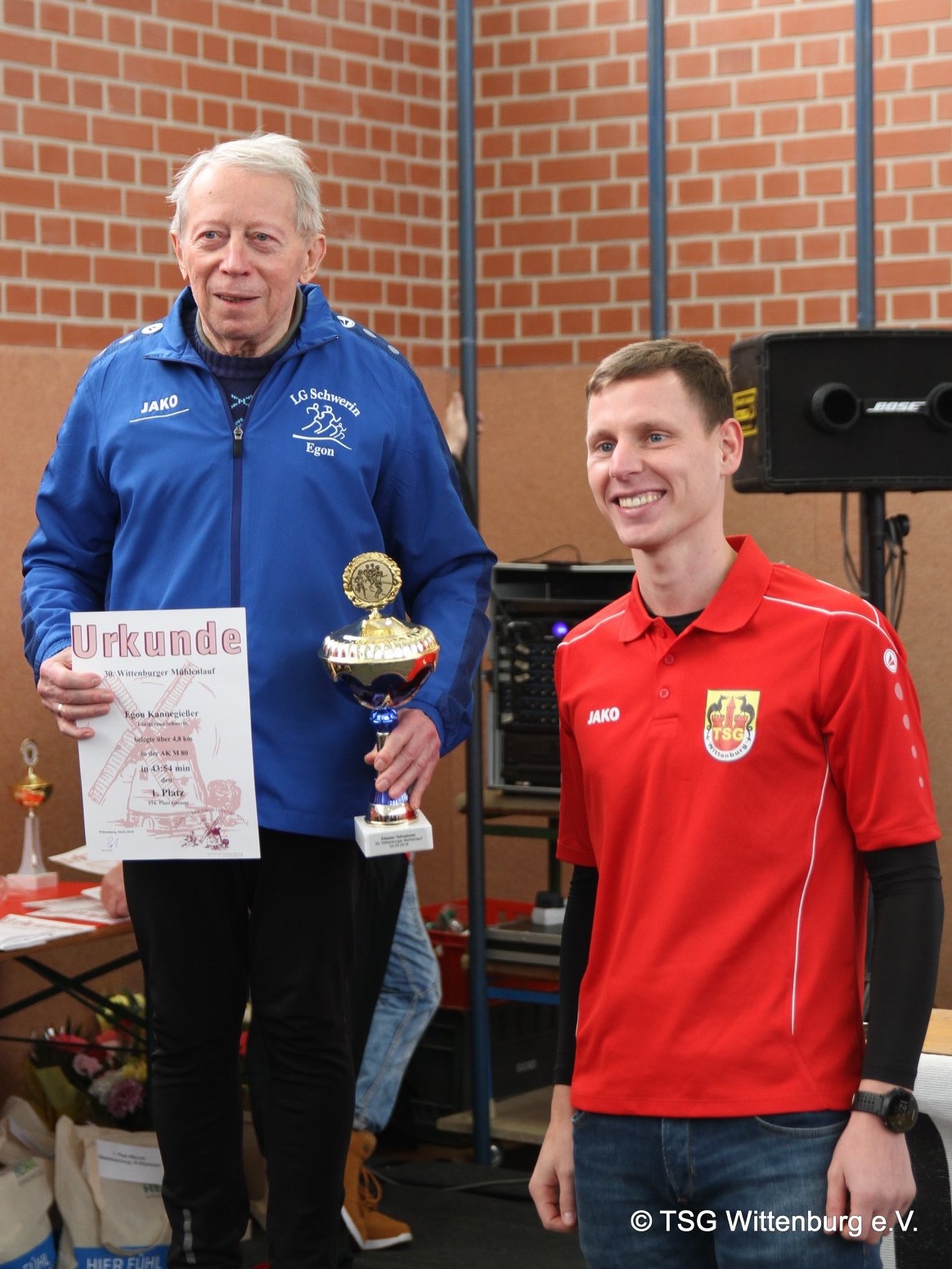 Bei Temperaturen um – 5 Grad begrüßte Wittenburg die Läuferscharr zum Laufcupauftakt und dem Laufjubiläum zum 30. Wittenburger Mühlenlauf. Von den kalten Temperaturen und recht frischem Wind ließen sich die Läuferinnen und Läufer aber nicht abschrecken und die rührseligen Veranstalter von der TSG Wittenburg durften sich über einen neuen Teilnehmerrekord freuen. Hierzu trugen auch unsere Sportlerinnen und Sportler bei. Für unseren Verein gingen 2 Läuferinnen und 17 Läufer beim Auftakt zum Laufcup Mecklenburg-Vorpommern an den Start. Dazu kamen mit Antonio und Tamino Briesen zwei Teilnehmer beim Intersport-Nachwuchslaufcup von Mecklenburg-Vorpommern. Auf der Schnee- und Eisfreien Strecke gab es trotz der frostigen Temperaturen hervorragende Zeiten und Ergebnisse für unsere Läuferinnen und Läufer. Im Hauptlauf über 10 Kilometer laufen Anja Wittwer, Mathias Ahrenberg und Eik Sperling in die TOP 10 der Gesamtwertung. Anja Wittwer wird mit 43:19 min Gesamtvierte und Siegerin ihrer Altersklasse W30 im Laufcup. Da die Gesamtzweite Justyna Kwiatkowska vom LG Nordheide nicht für den Laufcup MV startberechtigt ist, rückt Anja in der Cupgesamtwertung einen Platz hoch. Mathias Ahrenberg lief in der Topzeit von 34:51min als Gesamtdritter und Sieger seiner Altersklasse M35 ins Ziel. Da aber der Zweitplatzierte Christoph Deppe aus Hamburg nicht im Laufcup MV startet, gibt es in der Laufcupgesamtwertung den zweiten Platz. Im Cup als sehr guter Gesamtsechster und Sieger seiner M30 beendete Eik Sperling in 36:17 min erfolgreich den Wettkampf. Lothar Gajek wird in 44:54 min Zweiter seiner M60. Dritte Plätze in der Laufcupwertung gibt es für Ulrike Schöne (52:17 min) in der W50, Birger Bösel (38:55 min) in der M40, Giuseppe Avignone (41:55 min) in der M30 und Horst Schöne (1h12:44) in der M75. Mit ihren vierten Plätzen ging es für Harald Tschersich (M60) und Patrick Paul (M35) knapp am Podest vorbei. Harald lief 36:38 min und Patrick glatte 39 min. M30-Läufer Sebastian Scholz erreicht bei seinem Laufcupdebüt in 43:53 min einen 6. Platz. Frank Tschersich läuft in seiner M35 mit 41:29 min durchs Ziel. In der M50 gibt es durch Frank Leonhardt (43:32 min), Christian Briesen (44:39 min), Frank Riebschläger (54:39 min) und Christian Stapel (55:50 min) die Plätze 5, 7, 9 und 10. Lothar Domnick wird mit genau 44 min Neunter seiner M55. In der gleichen Altersklasse wird Sven Jonas in 48:04 min Elfter und Fred Kiesendahl mit 52:41 min Fünfzehnter. Den 4. Altersklassensieg für unseren Verein erläuft U 18-Läuferin Fanny Riese auf der 4,8 Kilometerstrecke. In Fannys Altersklasse erfolgte die Laufcupwertung über 4,8 Kilometer und sie siegte bei ihrer Laufcupprämiere in 20:25 min. In der Altersklasse U16 wurden die Punkte auch auf der 4,8 Kilometerstrecke vergeben und Tamino wurde mit 28:54 min Fünfter. M80-Oldie Egon Kannengießer und W45-Läuferin Birga Briesen liefen außerhalb des Cups ebenfalls über 4,8 Kilometer. Egon Kannegießer, als ältester Teilnehmer des 30. Wittenburger Mühlenlauf, siegte hier in seine Altersklasse mit 43:54 min. Birga Briesen wurde Fünfte in 29:18 min. Für Antonio ging es im Nachwuchscup in der Altersklasse U12 über 1,5 km und mit seinen 8:03 min bedeuteten wurde er Achter.